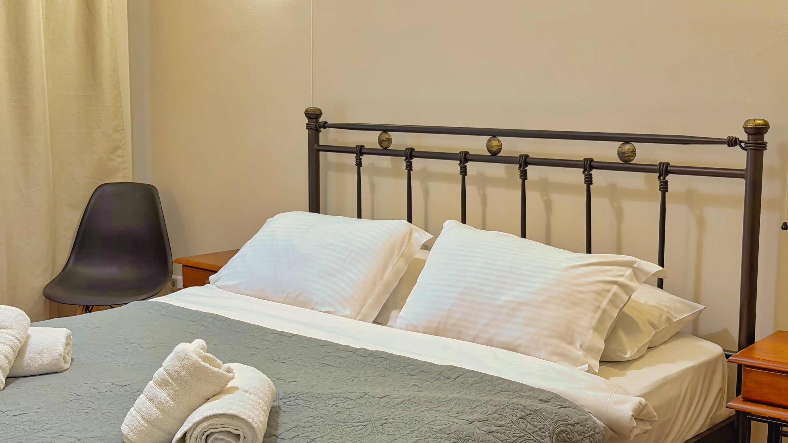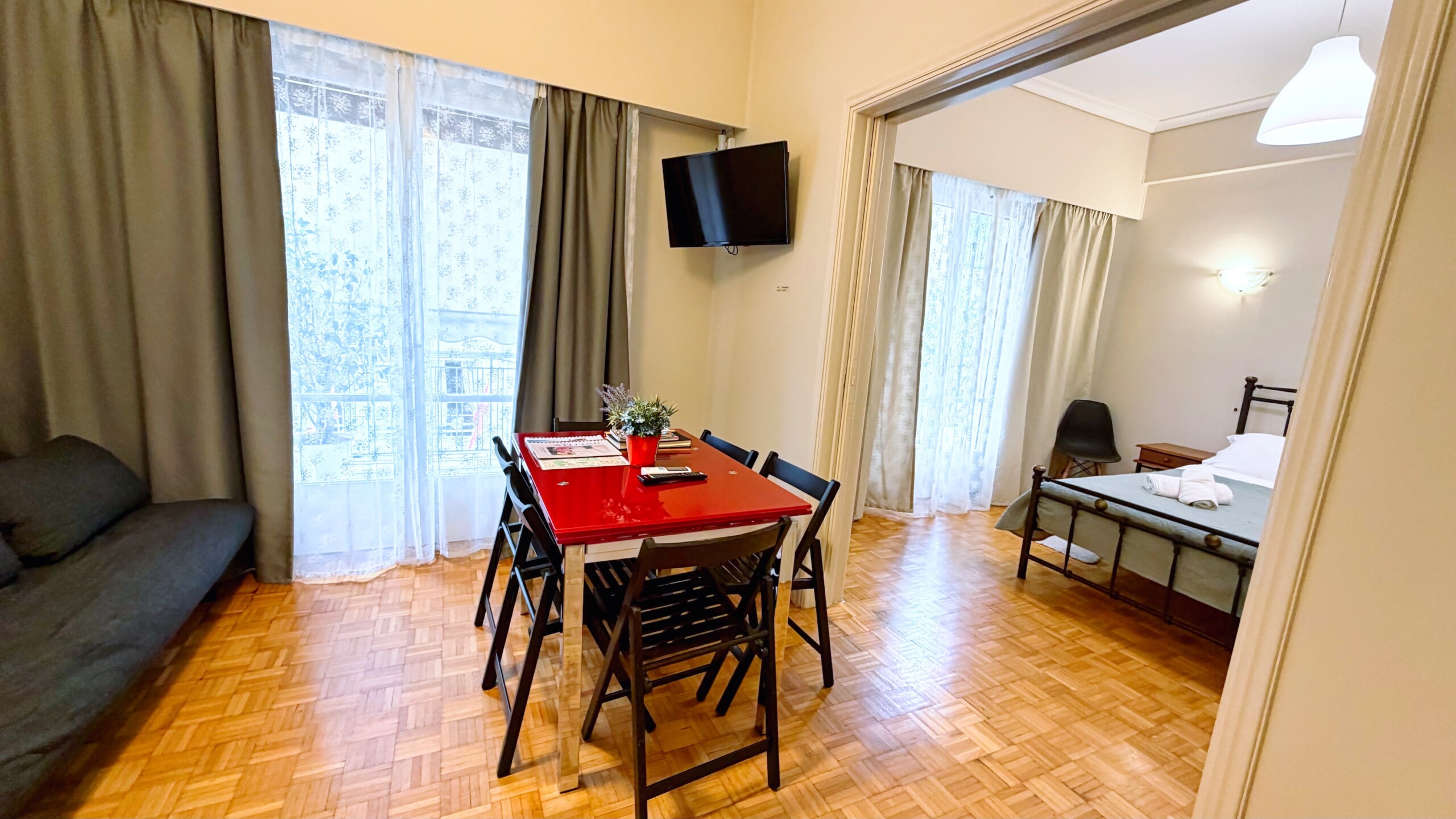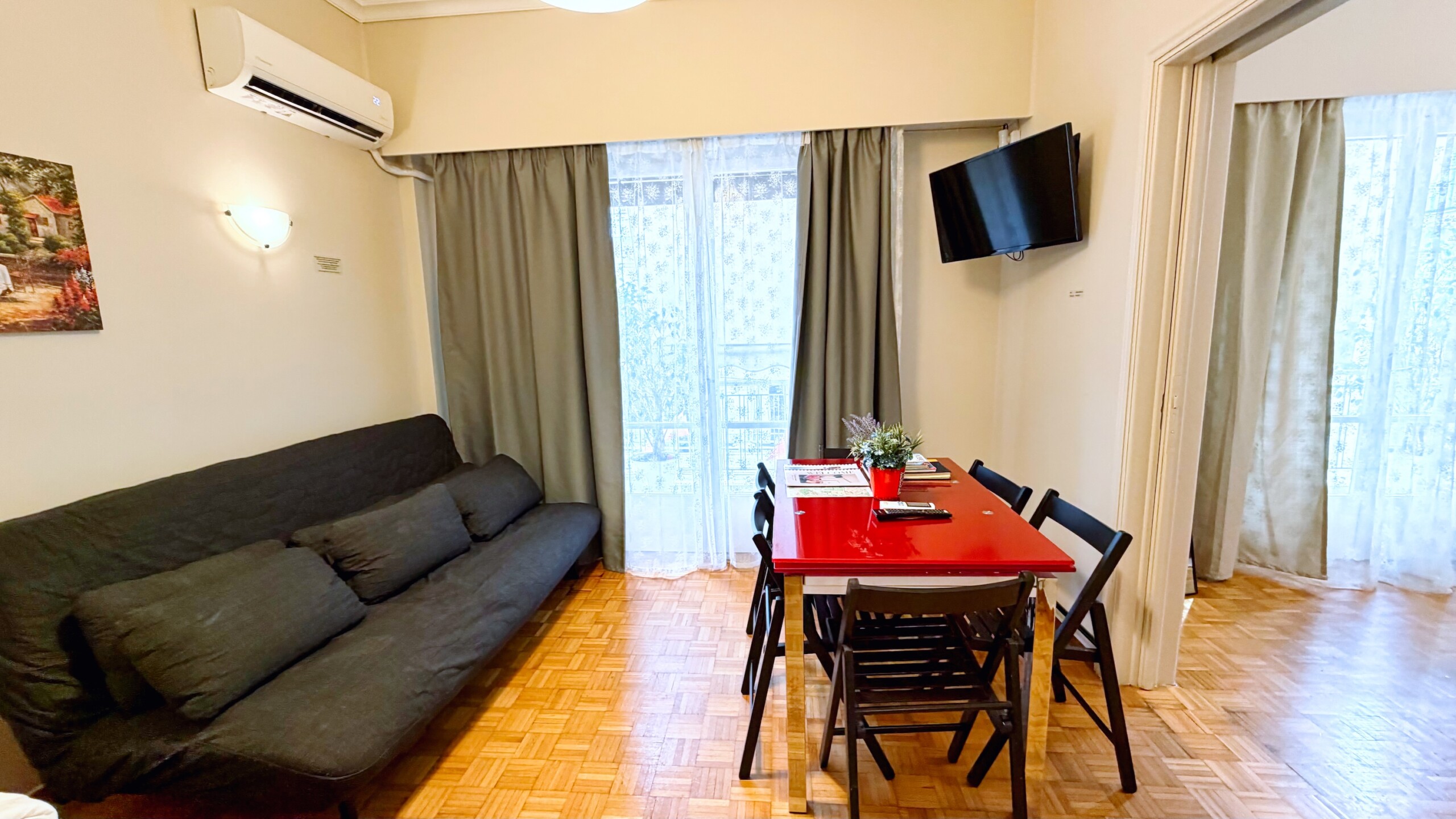 Two bedrooms, a living room with two sofas (that become two double beds), a dining area, fully equipped kitchen, one modern bathroom, spacious with a balcony and comfortable! If you look for high standards, this is your place!